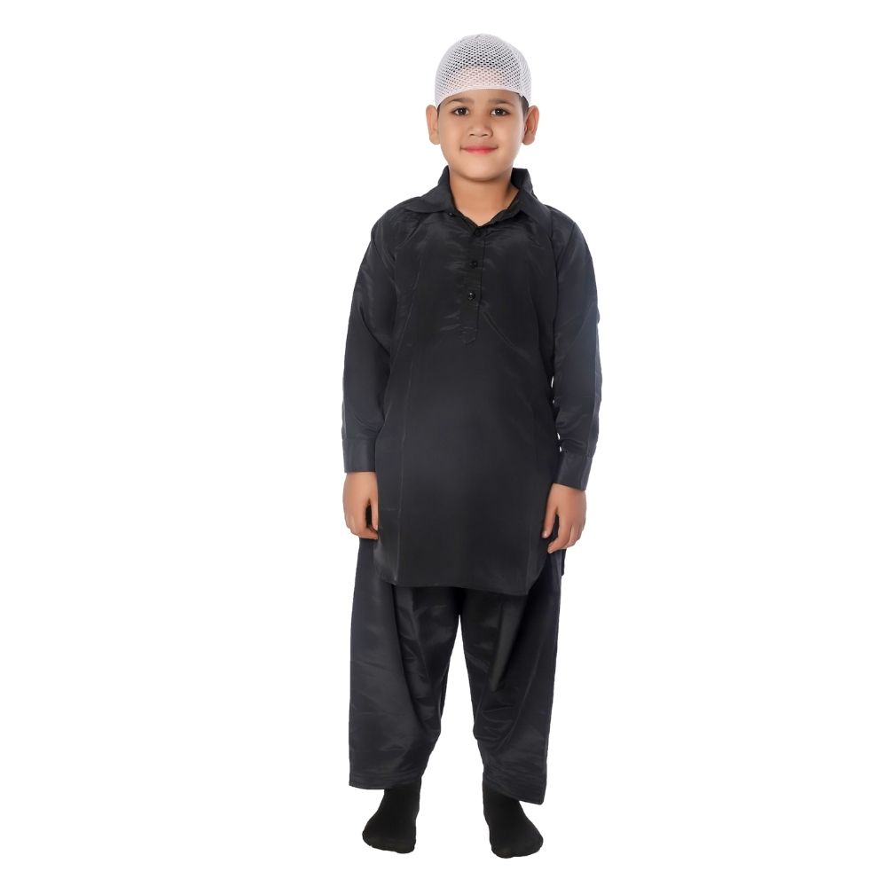 This complete traditional set includes a Kurta, Salwar, and Matching Cap, giving a well-coordinated and authentic Pathani look. The fine stitching and clean tailoring enhance the overall presentation, making it suitable for cultural events, annual day celebrations, and community programs.
