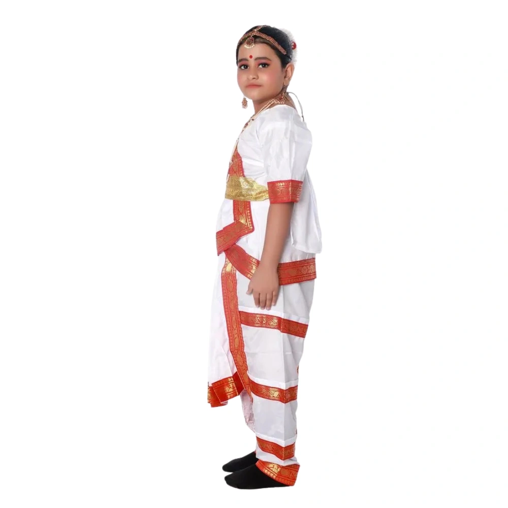 Bharatanatyam Dress Costume in White & Red is crafted for young dancers and stage performers who want a traditional and graceful look. The classic white base with red border gives it a timeless appeal, while the soft Chairman fabric ensures comfort during long dance sessions and performances.