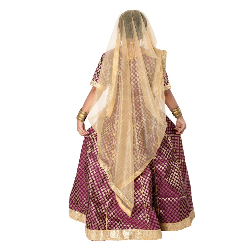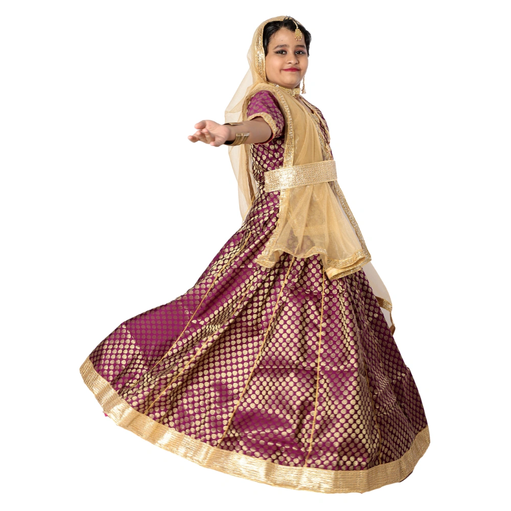 Kathak Costume by Sanskriti Fancy Dresses is a beautifully designed classical dance dress perfect for young Kathak performers and stage artists. Crafted using premium Chanderi Brocade and shimmer net fabric, it offers an elegant flow and royal appearance during dance movements.