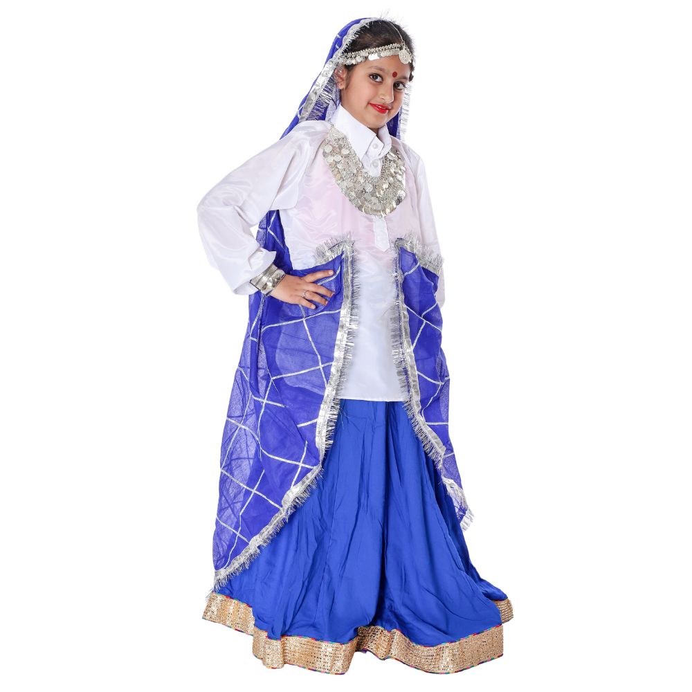 The Folk Dance / Haryanvi Traditional Wear is suitable for female performers of all age groups. The attractive Blue & White color combination enhances the traditional charm, while the Chairman, Cotton & Crepe fabric blend provides comfort, breathability, and durability for long hours of performance. It is ideal for Haryanvi Dance, Fancy Dress Competitions, Stage Shows, and Cultural Events.