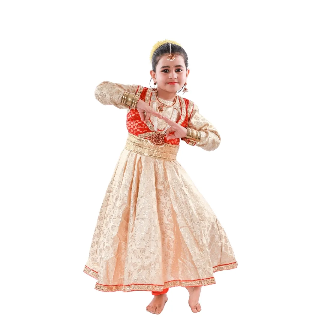 The Kathak Dance Dress Classical Costume – Beige, Red & Golden Color is designed for classical dance performances and cultural stage events. Crafted using premium brocade and satin fabrics, this costume offers a rich traditional look with maximum comfort, making it ideal for long stage performances and special occasions.