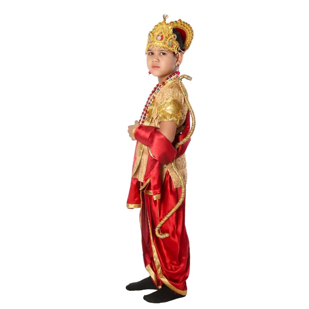 The complete set includes a traditional dhoti, kurta, dupatta, and matching royal accessories to create an authentic kingly appearance. The detailed stitching and regal styling help your child confidently embody a mythological Hindu Raja character.