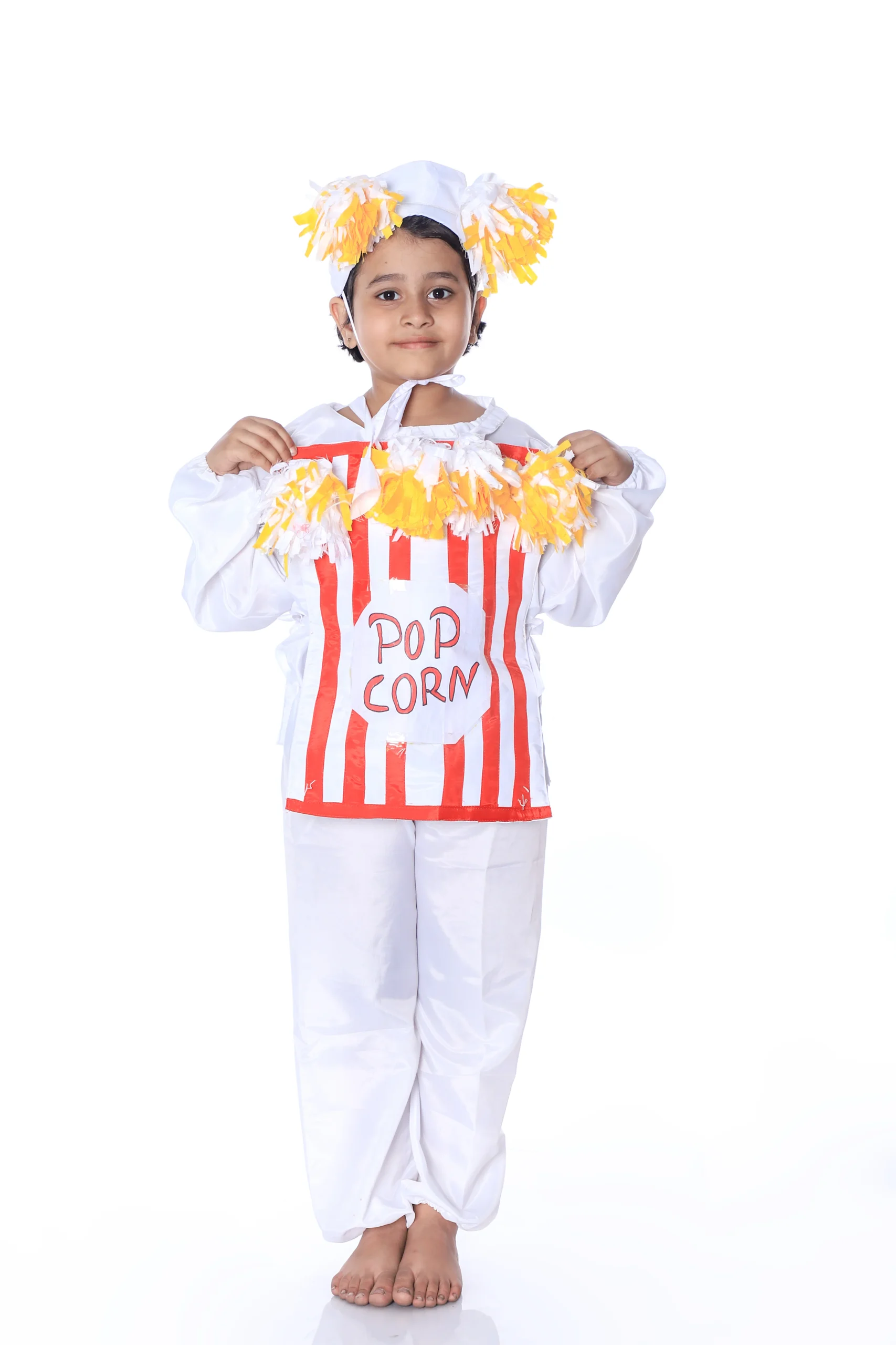 This complete Popcorn Fancy Dress Costume includes a popcorn-themed dress, giving a ready-to-wear snack character look. The simple yet attractive styling makes it suitable for school functions, theme parties, and creative stage performances.