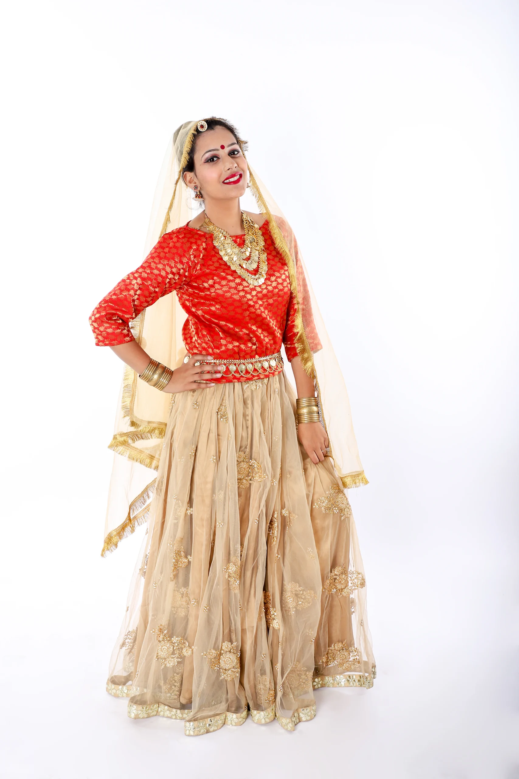 - Radha Rani Inspired Design: Traditional Red & Golden lehenga choli perfect for Janmashtami celebrations and mythological performances.