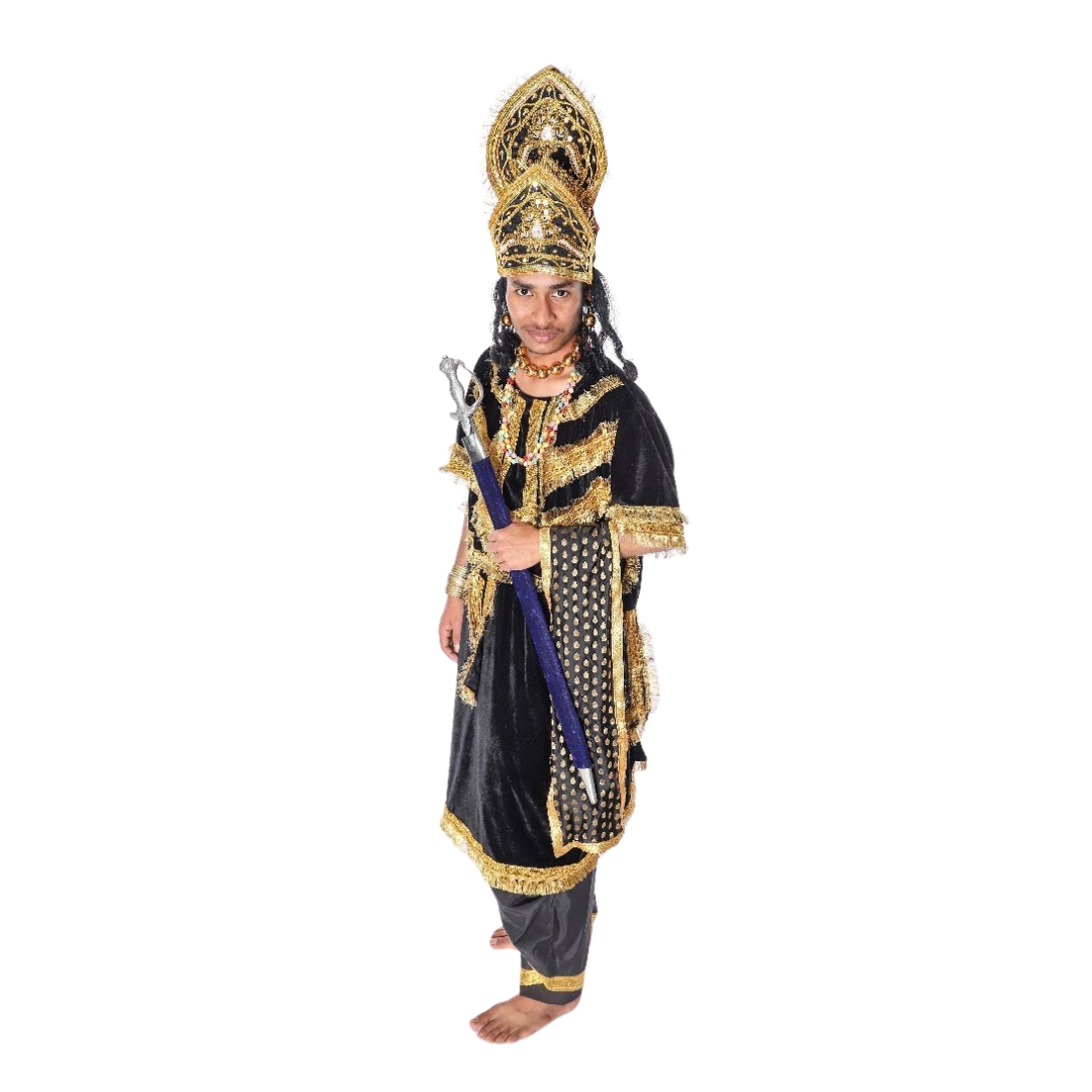 The Ravan Fancy Dress Costume in Black for Boys – Ramleela Drama Costume is specially designed for children performing powerful mythological roles in Ramleela and stage dramas. This grand black outfit reflects the majestic and royal appearance of the legendary character Ravan, making it perfect for cultural programs and school performances.