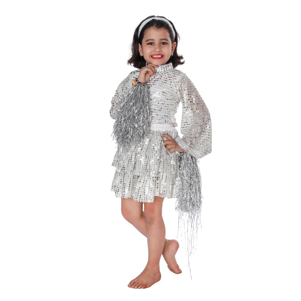 If you are looking for a sparkling and fashionable Western Dance Skirt Top Costume for Girls, this silver stage performance dress is a perfect choice for fancy dress competitions, dance performances, school and college functions.