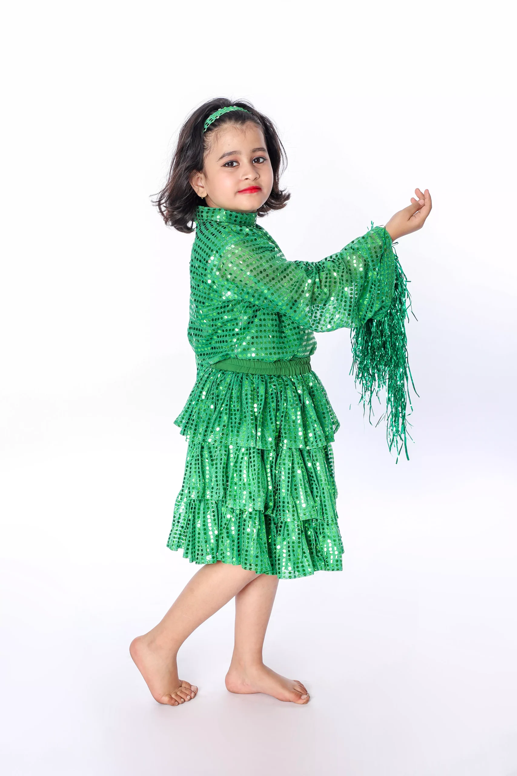 The Western Frock Dance Fancy Dress for Girls – Green is specially designed for young performers who love to shine on stage. This stylish Western Frock Dress is crafted with a blend of sequin, net, and satin fabric, giving a glamorous look while ensuring comfort for long dance performances and school events.